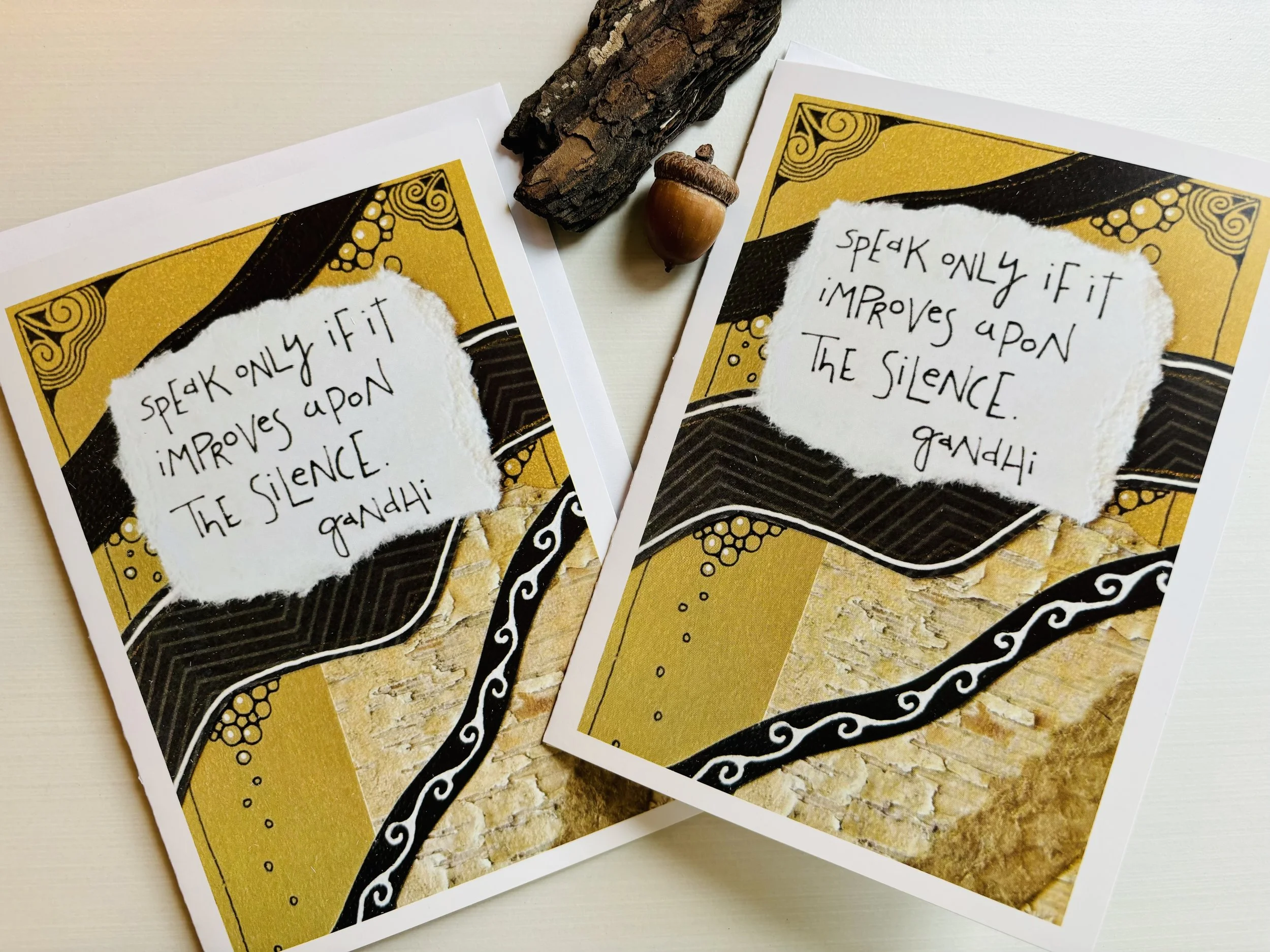 The artwork on this 5 x 7” card is from my 2024 100 Day Project focused on LISTENING. The mixed media art carries a reminder to “Speak only if it improves upon the silence”. The art is appropriate for a variety of occasions with the inside of the card blank for your own personal message to be added.